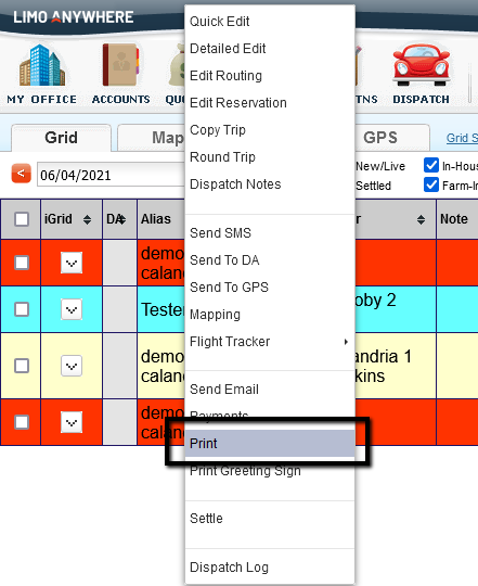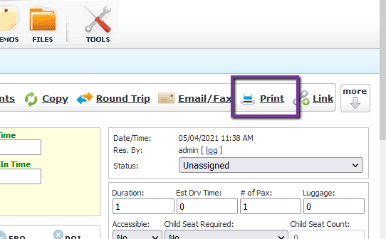 - Go to the ‘Print’ screen of the reservation. This can be accessed from the Reservation or the Dispatch Grid.