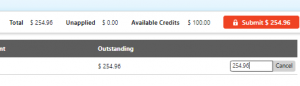 4. Available Credits appears with any other payments available to apply. Click Apply to Invoice to open the dollar value window. Notice this window defaults to total amount due. Don’t forget to change it to the amount you want to apply before you hit Submit.