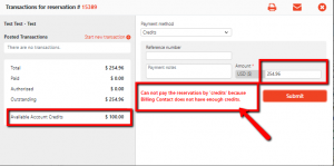 - From the Reservation – click Payments and select “Credits” from the list of Payment methods. Notice the Payments window shows transactions related to this reservation, as well as Available Account Credits:
